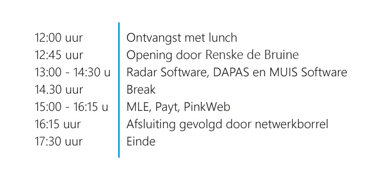 Organisatie: MUIS Software, Radar Software, MLE, PinkWeb, Dapas en Payt